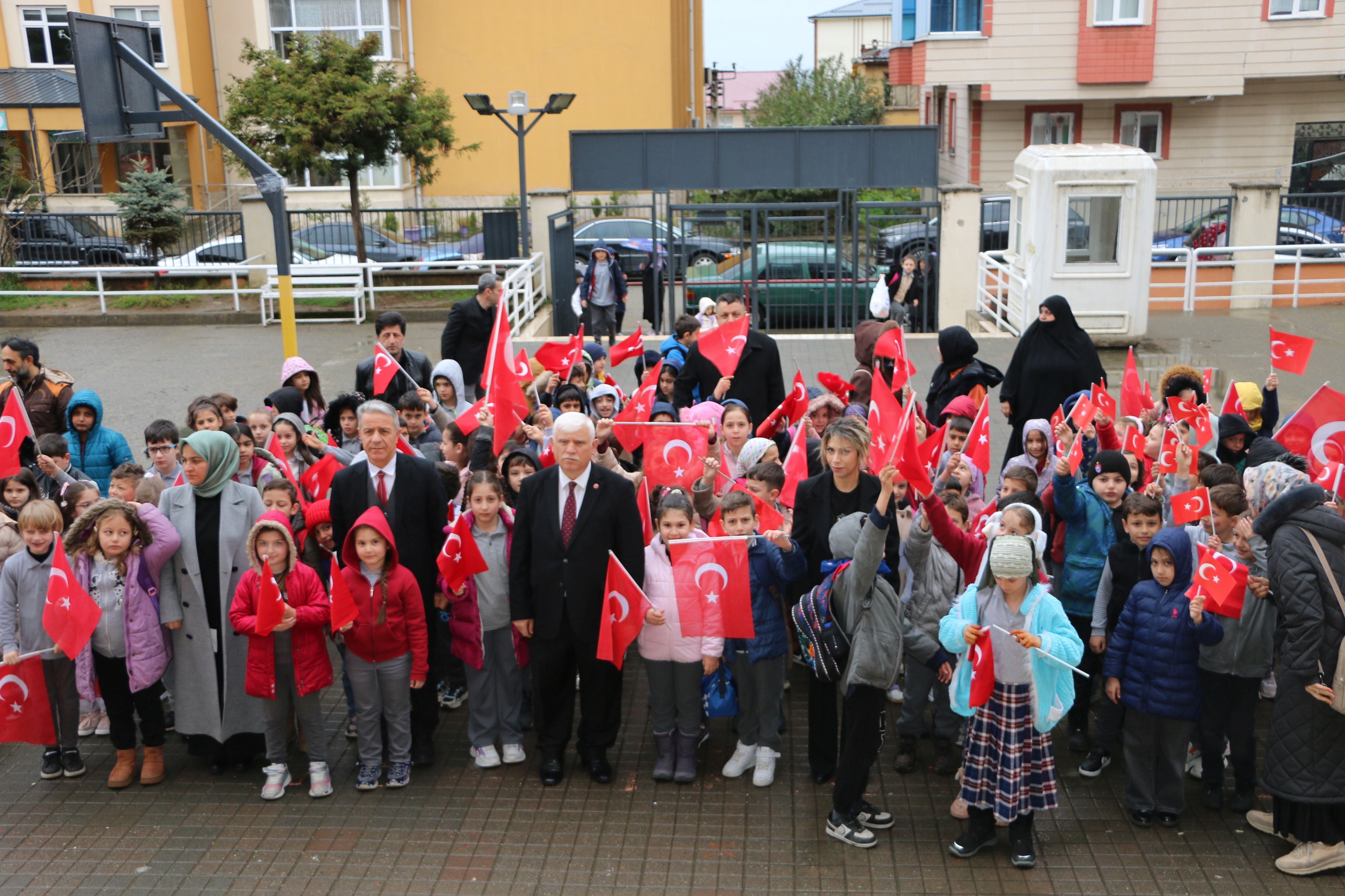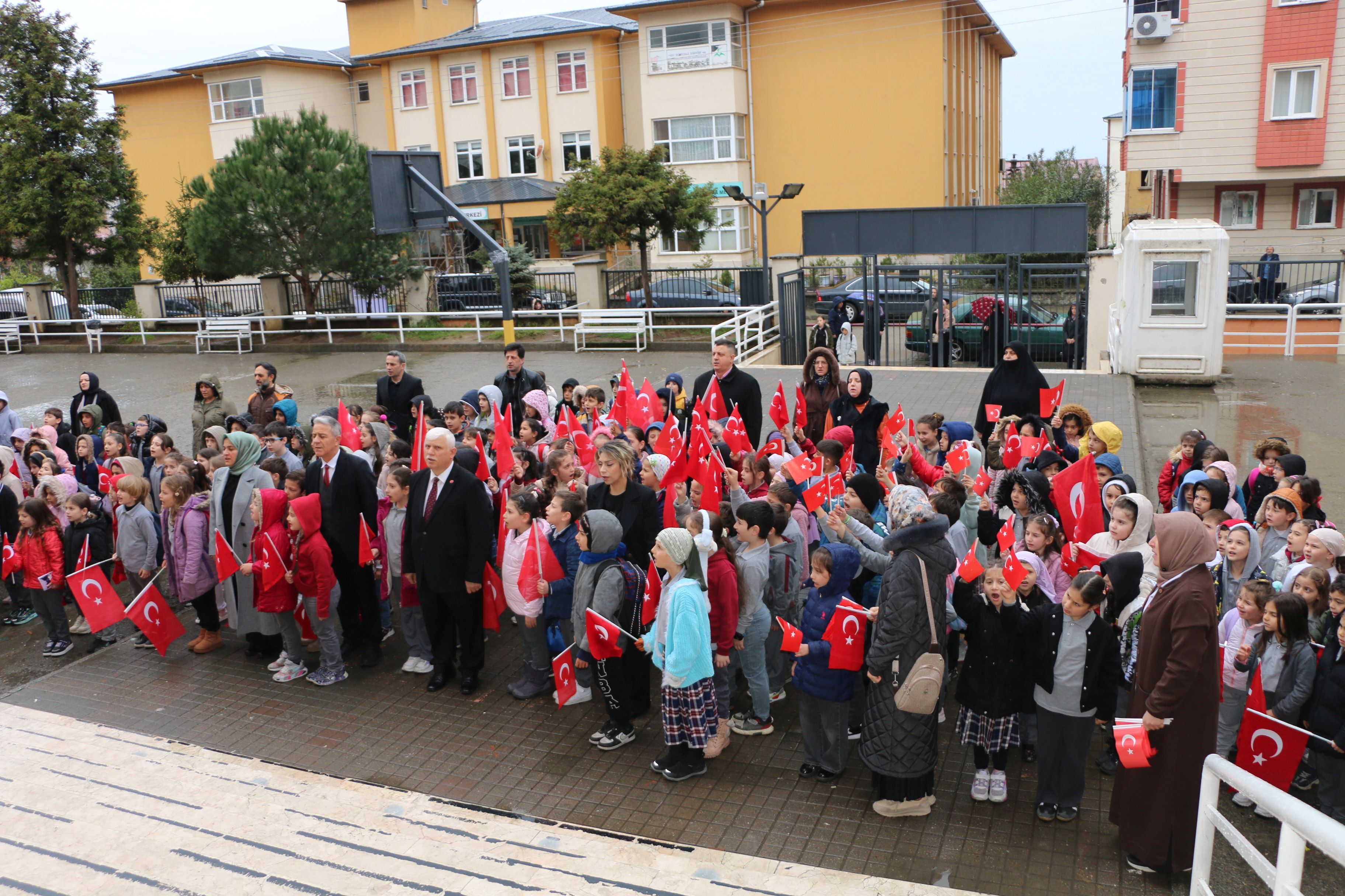 Törende Müdür Kabahasanoğlu ve şube müdürleri, öğretmenler ve öğrencilerle birlikte ellerinde Türk Bayrakları ile saygı duruşunda bulundular. Ardından İstiklal Marşı’nı okudular.