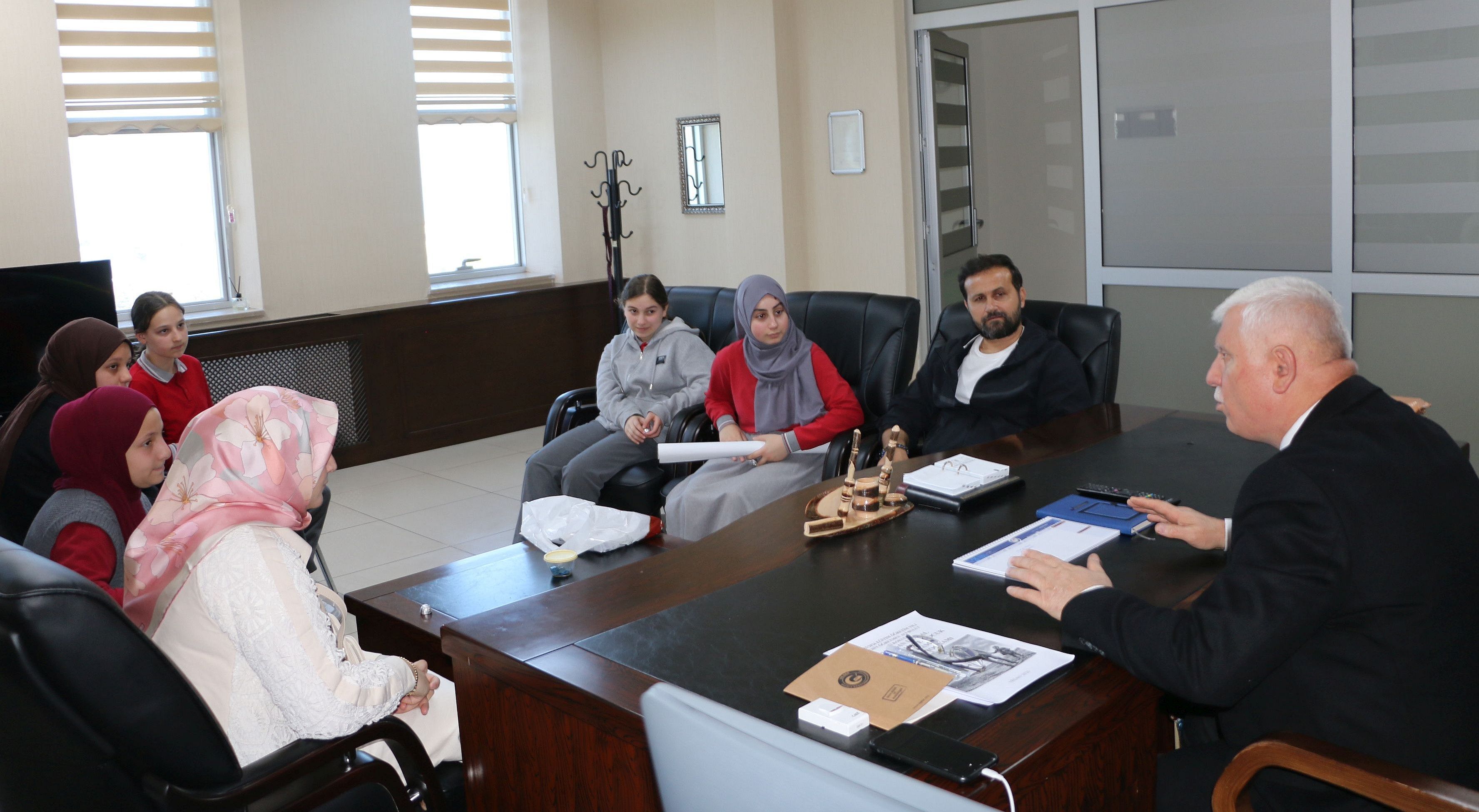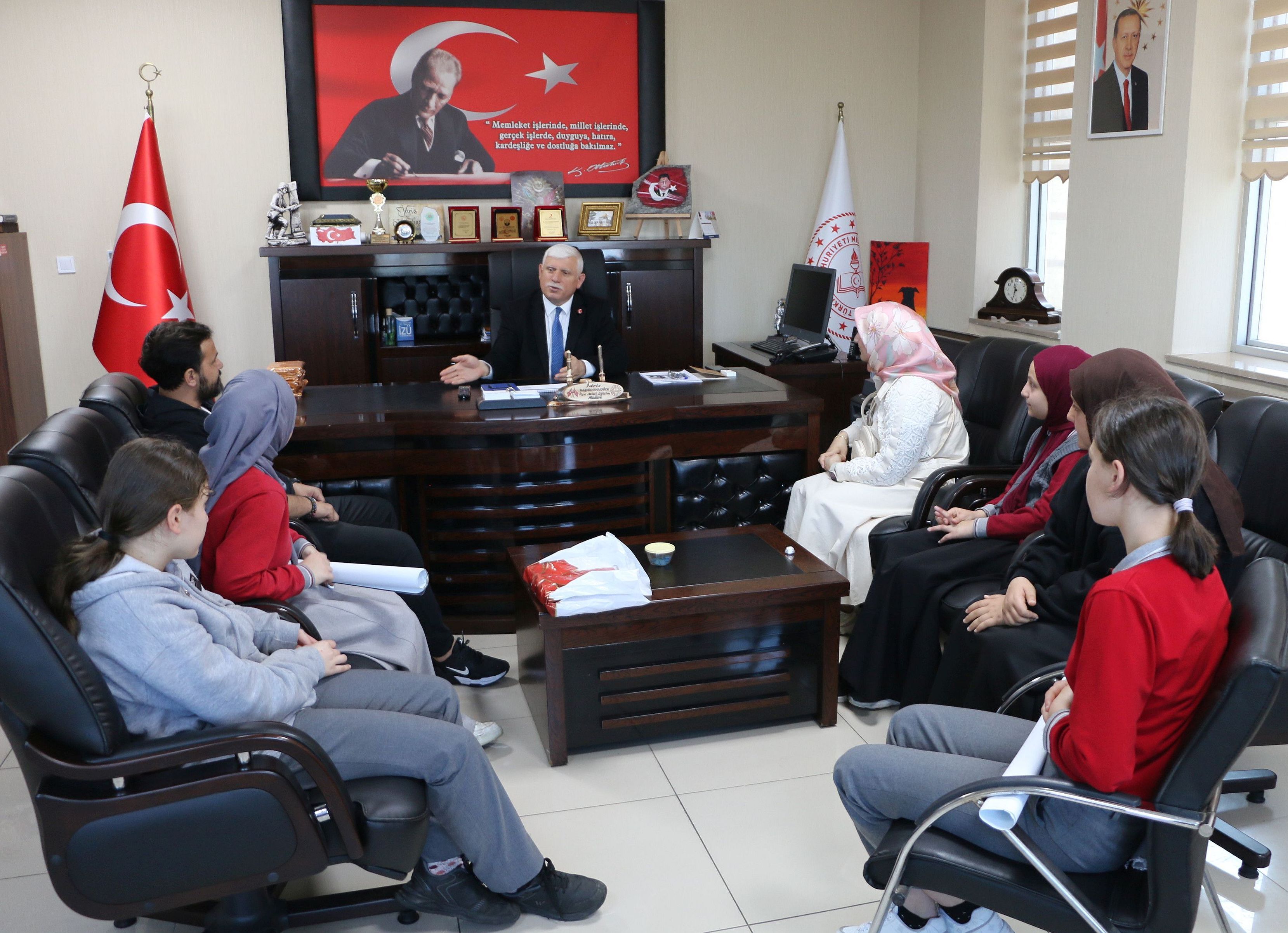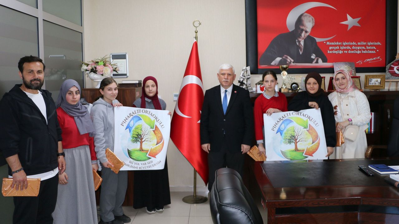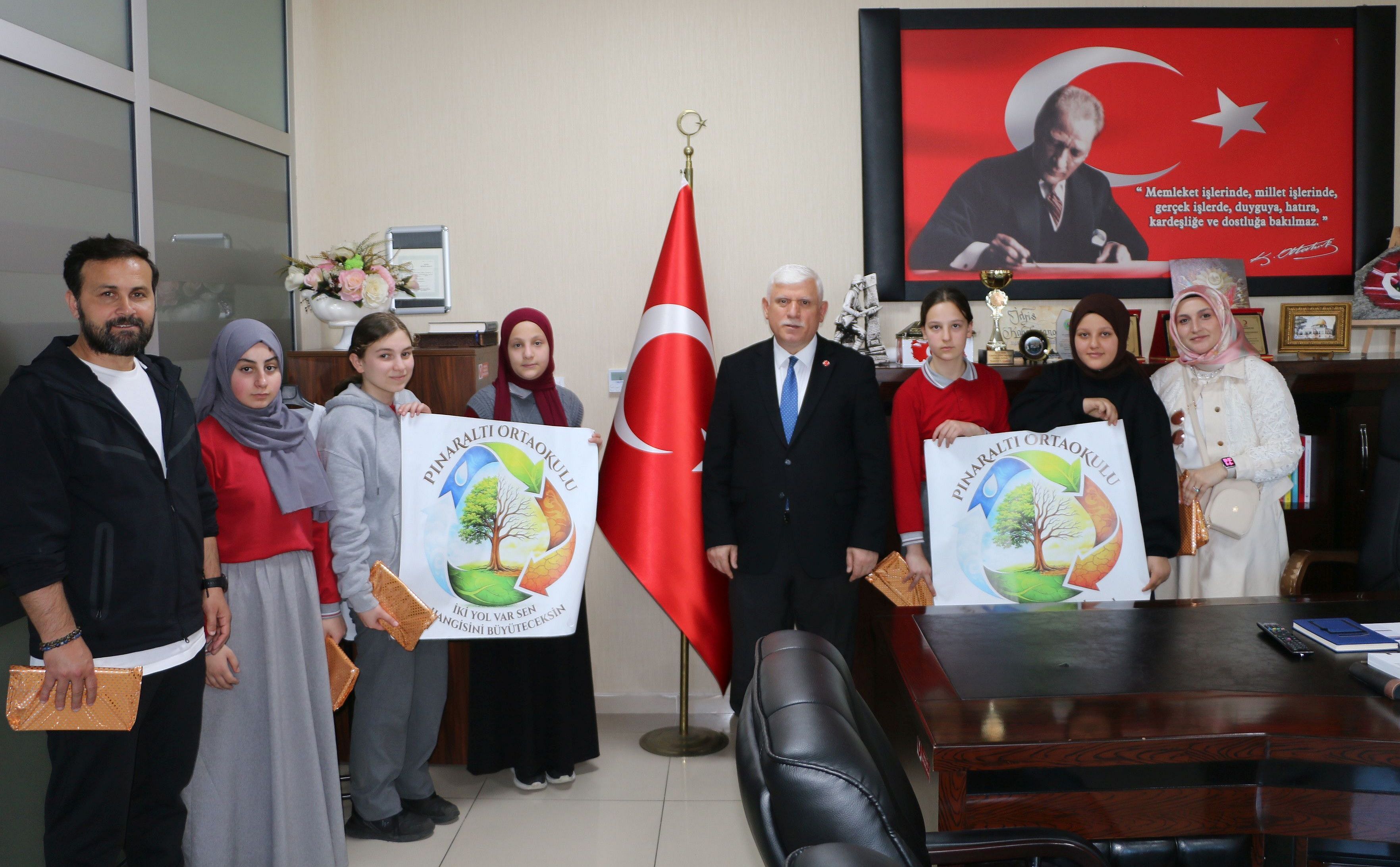 Pınaraltı Ortaokulundan Proje Koordinatör Öğretmeleri Din Kültürü ve Ahlak Bilgisi Öğretmeni Ayşenur Karın, Beden Eğitimi Öğretmeni Münür Satılmış ve görevli bir grup öğrenci İlçe Milli Eğitim Müdürü İdris Kabahasanoğlu’nu ziyaret ederek projelerini anlattılar.