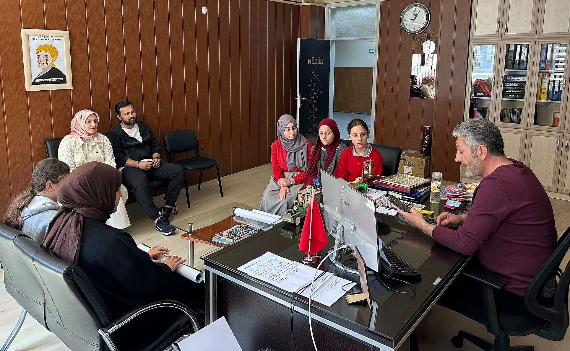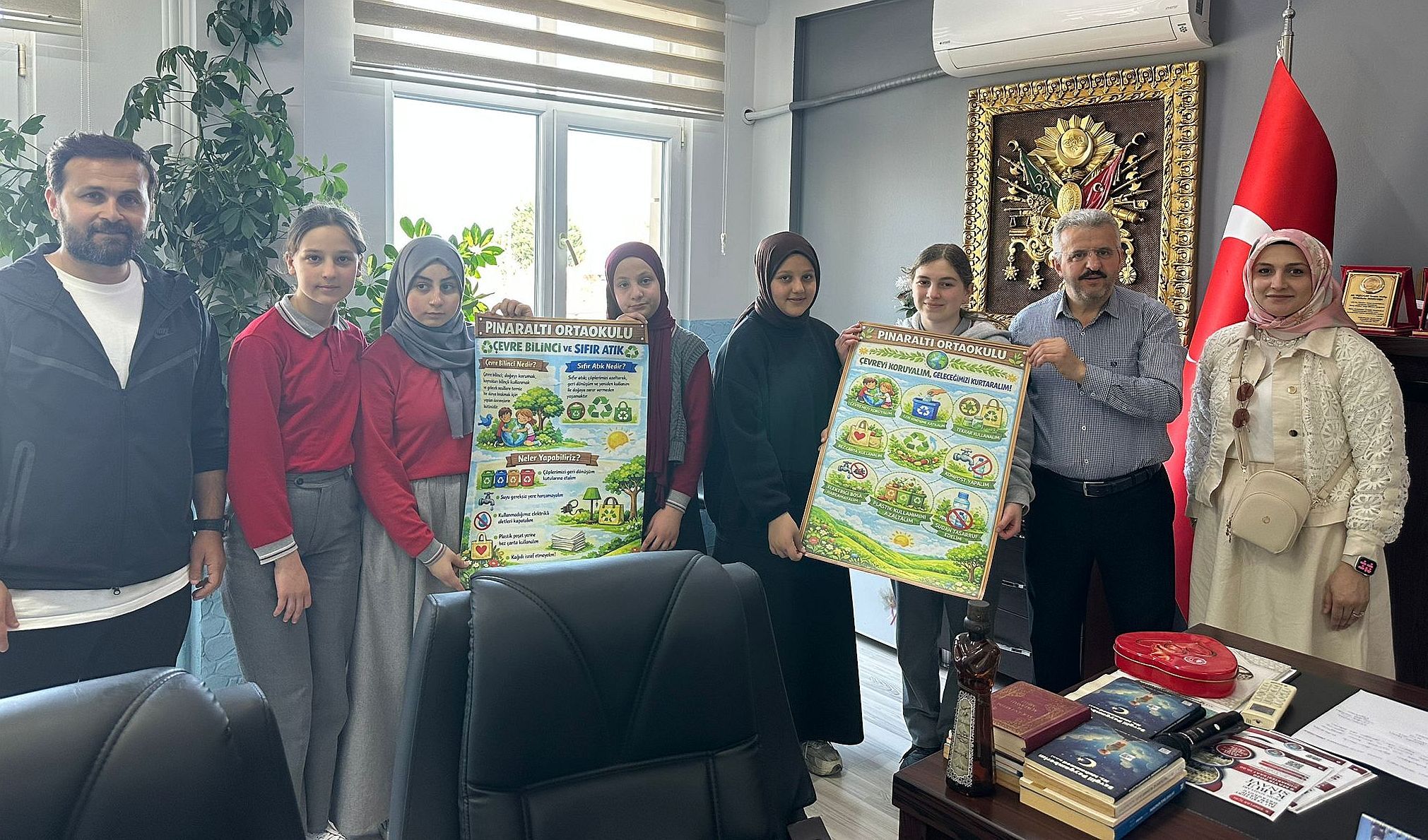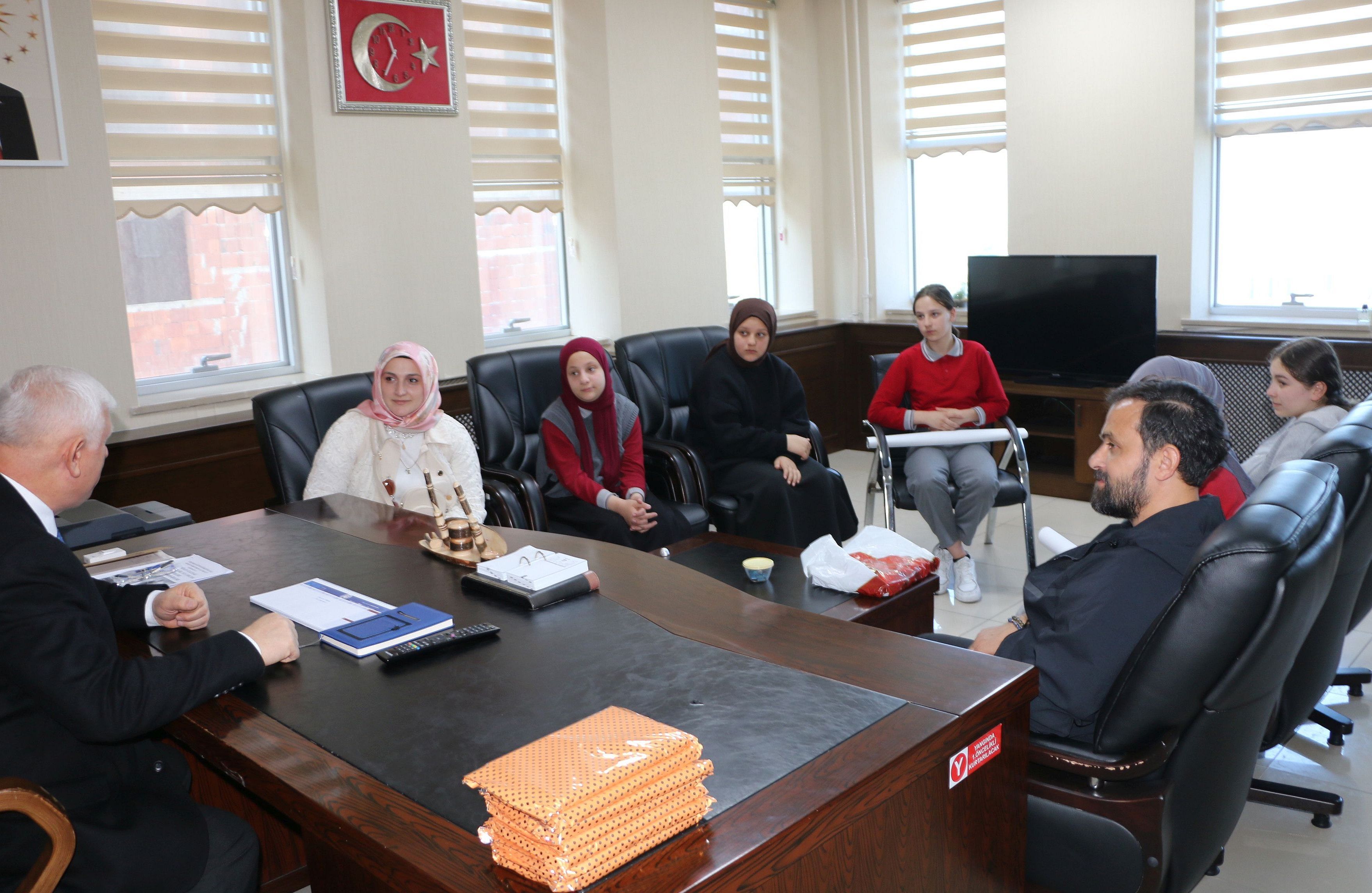 Pınaraltı Ortaokulundan Proje Koordinatör Öğretmeleri Din Kültürü ve Ahlak Bilgisi Öğretmeni Ayşenur Karın, Beden Eğitimi Öğretmeni Münür Satılmış ve görevli bir grup öğrenci İlçe Milli Eğitim Müdürü İdris Kabahasanoğlu’nu ziyaret ederek projelerini anlattılar.
